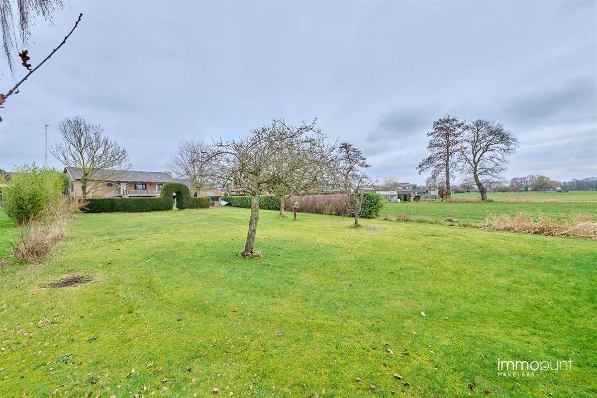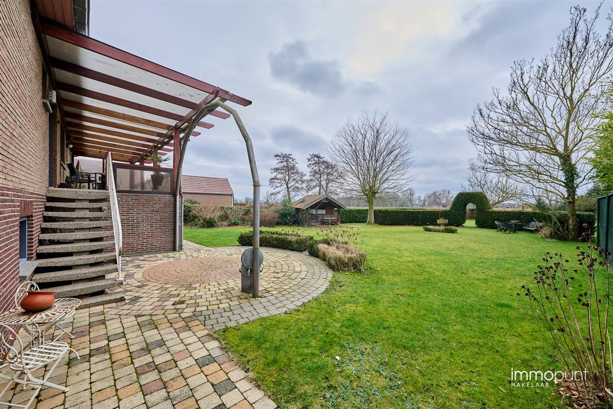 Aan de achterzijde van de woning, ter hoogte van de keuken en woonkamer is er een riant overdekt terras van 25m². Hier is het heerlijk vertoeven en kan u genieten van de groene tuin en het kilometers verre zicht over de weilanden. Het eerste deel van de tuin is een mooi aangelegde siertuin en wanneer u onder de groene boog loopt komt u op een enorm grasveld met diverse fruitbomen. Een fijne plek voor spelende kinderen of voor het houden van (klein)vee. Wegens het niveauverschil van de woning is de kelder rechtstreeks toegankelijk vanuit de tuin: zeer handig voor het opbergen van tuingereedschap, maar ook voor het buiten drogen van de was.
