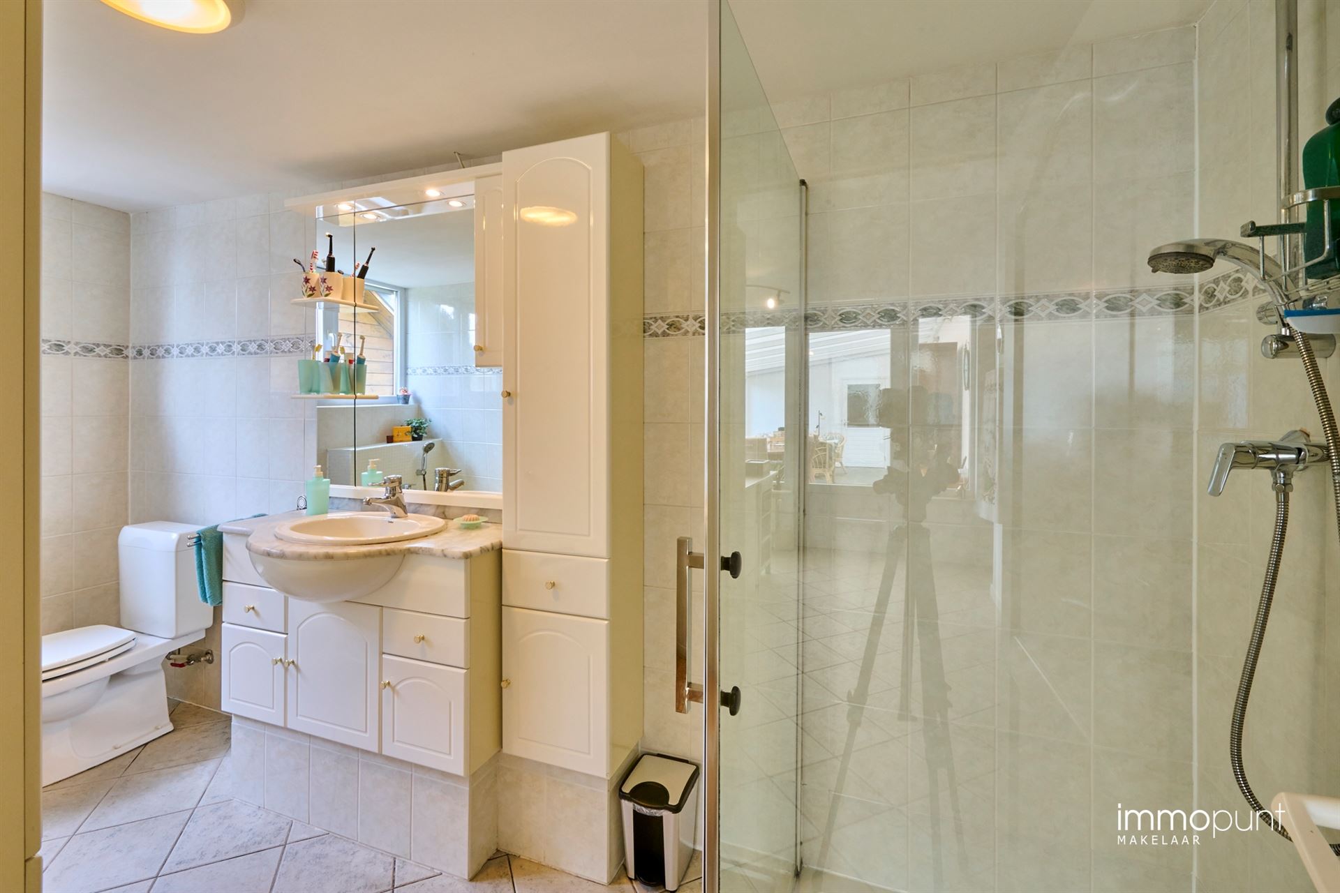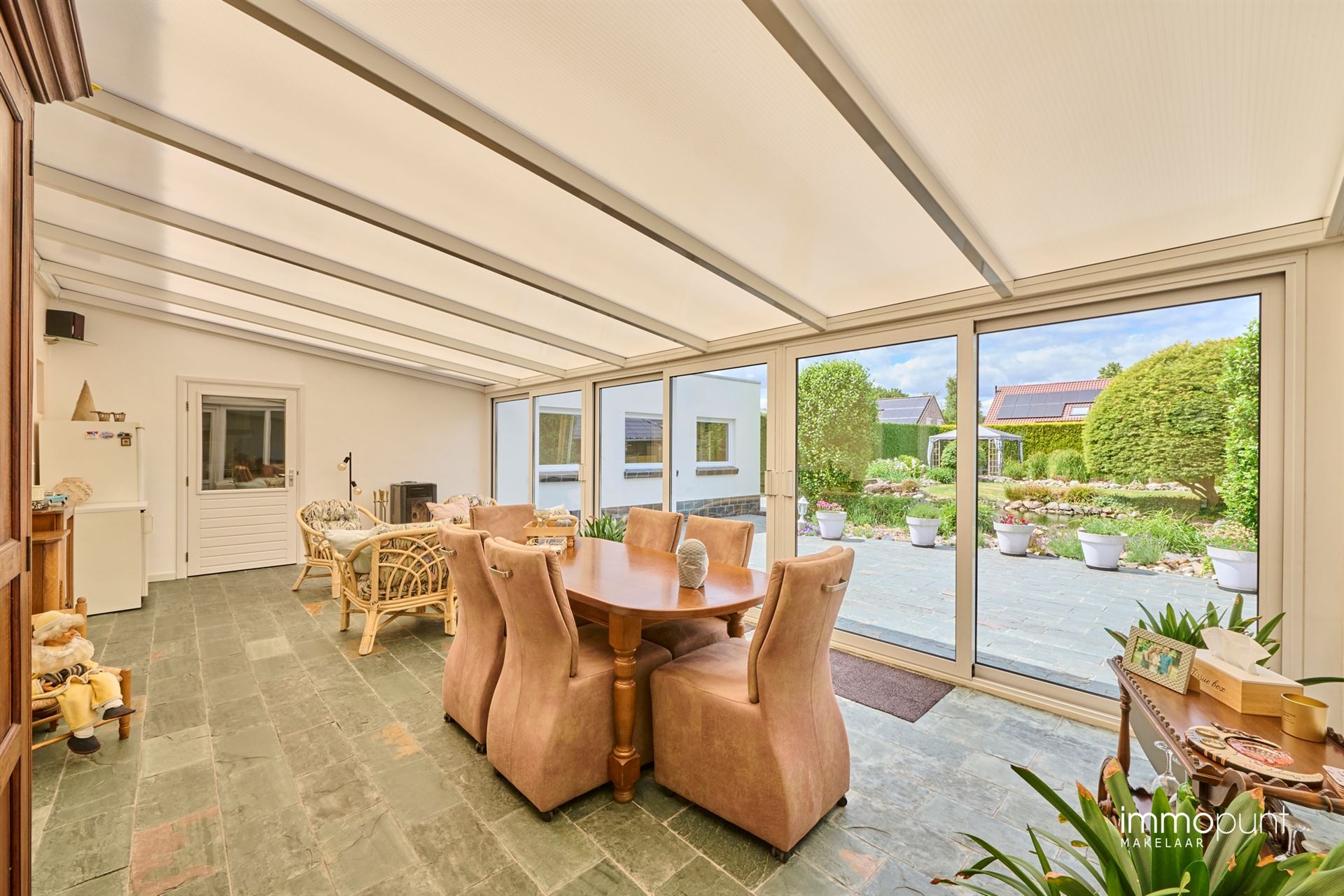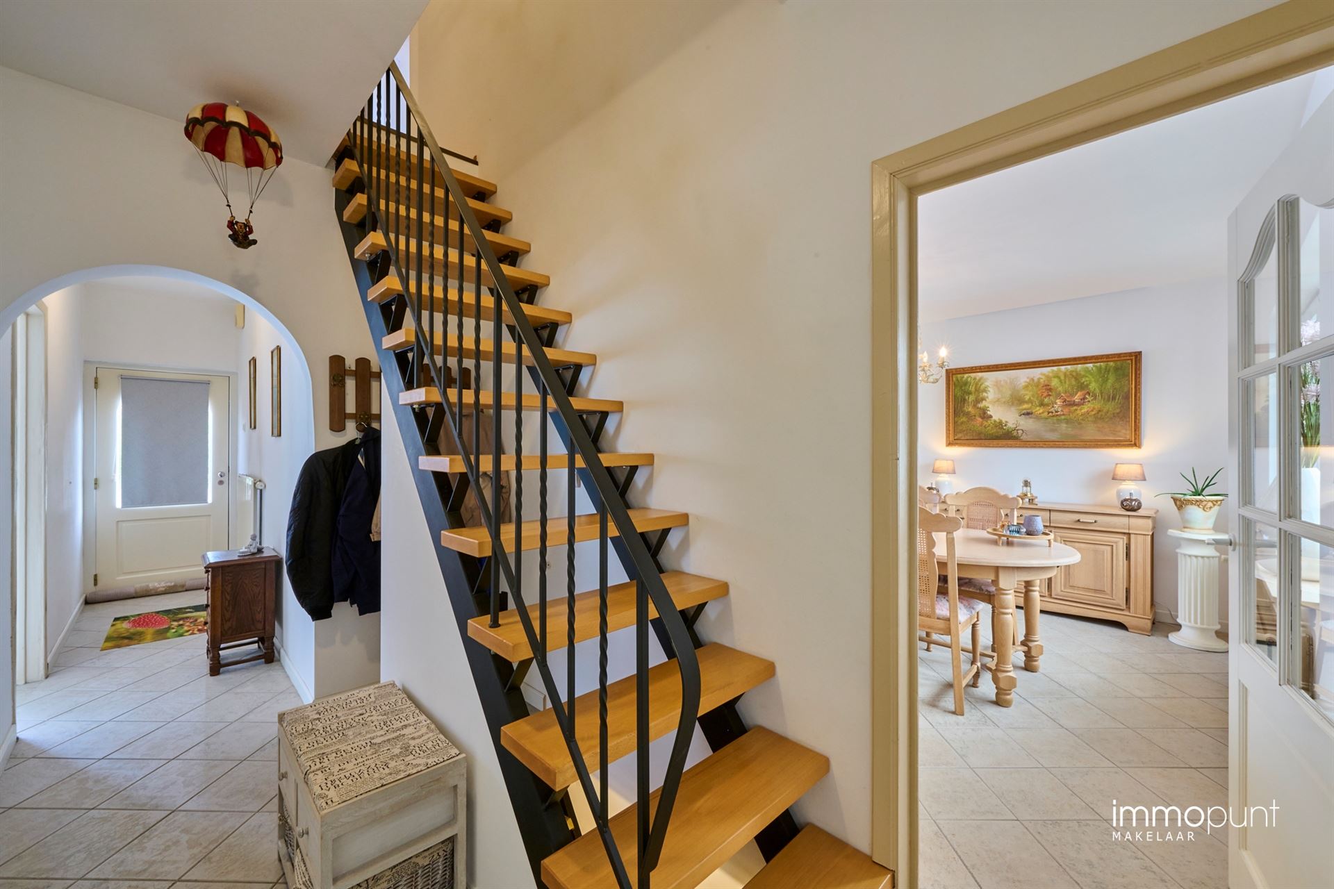 Gelijkvloers vind je, direct aan de voordeur een aparte tv- of kantoorruimte, ideaal voor de uitoefening van een beroep aan huis. Gezellige woonkamer. Moderne open keuken met een eiland en een eetkamer. Aan de achterzijde van de woning is er een riante veranda (32m²) met zicht op de prachtige tuin. Verder zijn er een badkamer met ligbad en douche, een gastentoilet en een multifunctionele extra kamer (bureau/hobbyruimte/4e slaapkamer). Via de gang is er toegang tot een kelder. De garage van 41 m² is een absolute troef: voorzien van smeerput en rechtstreeks bereikbaar via de veranda.