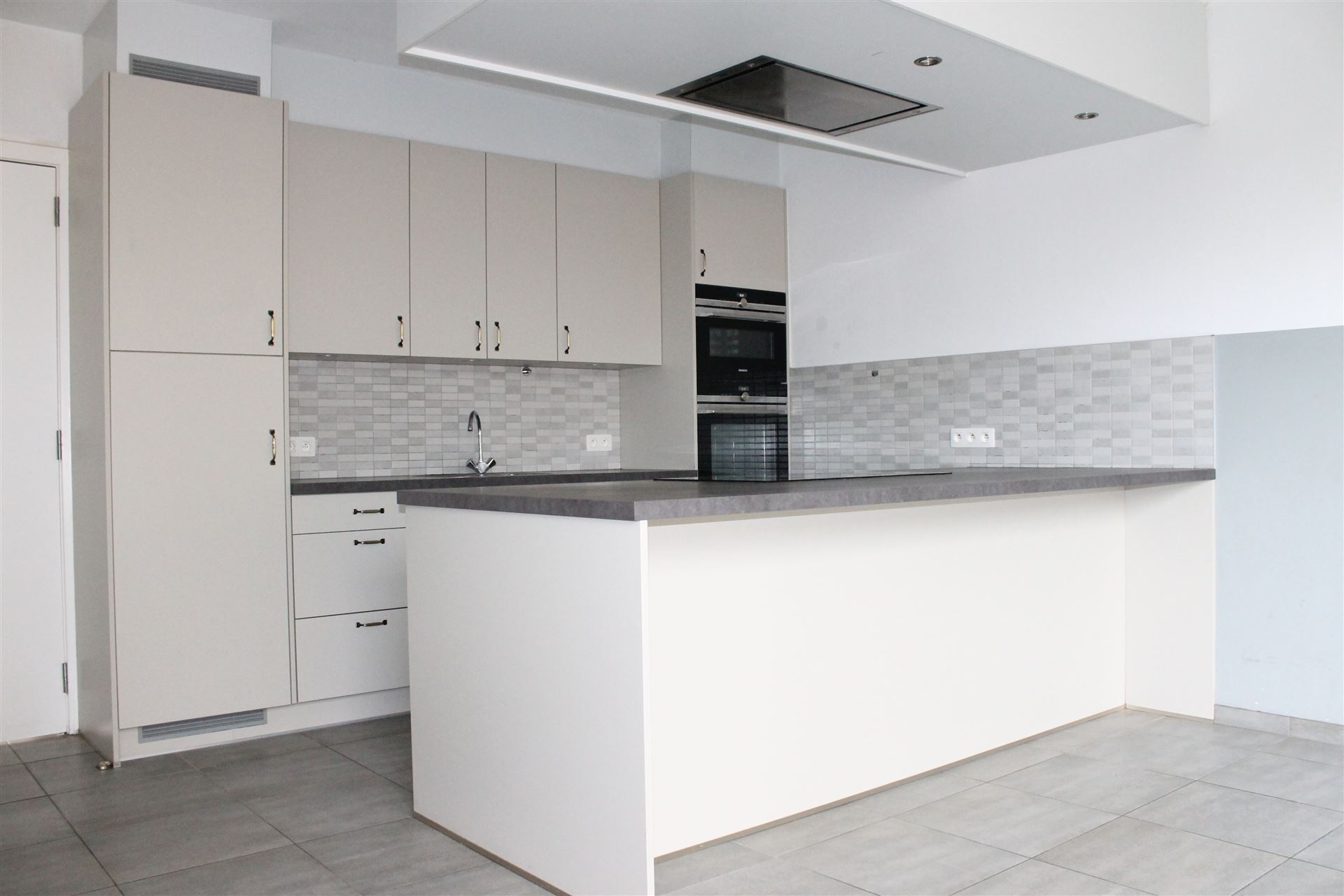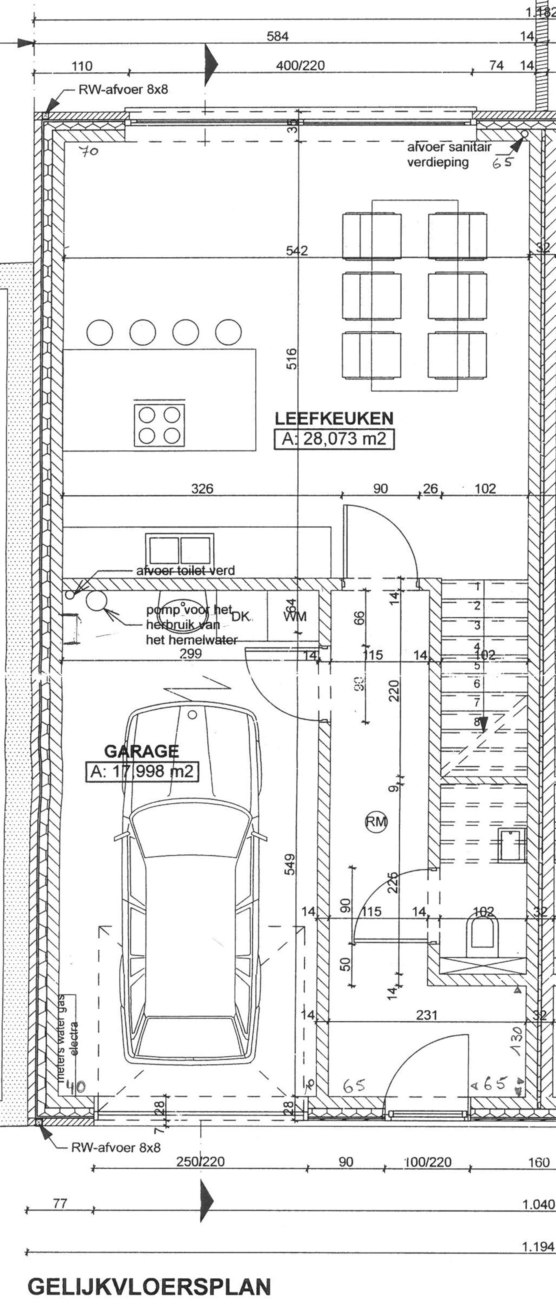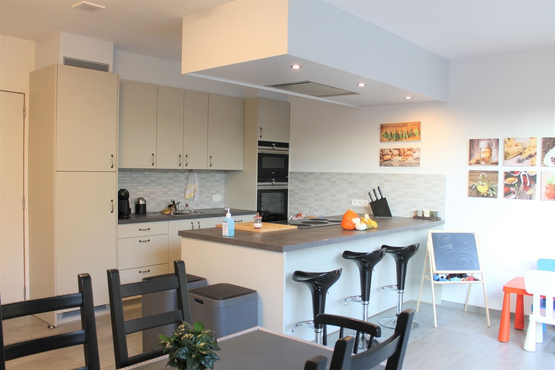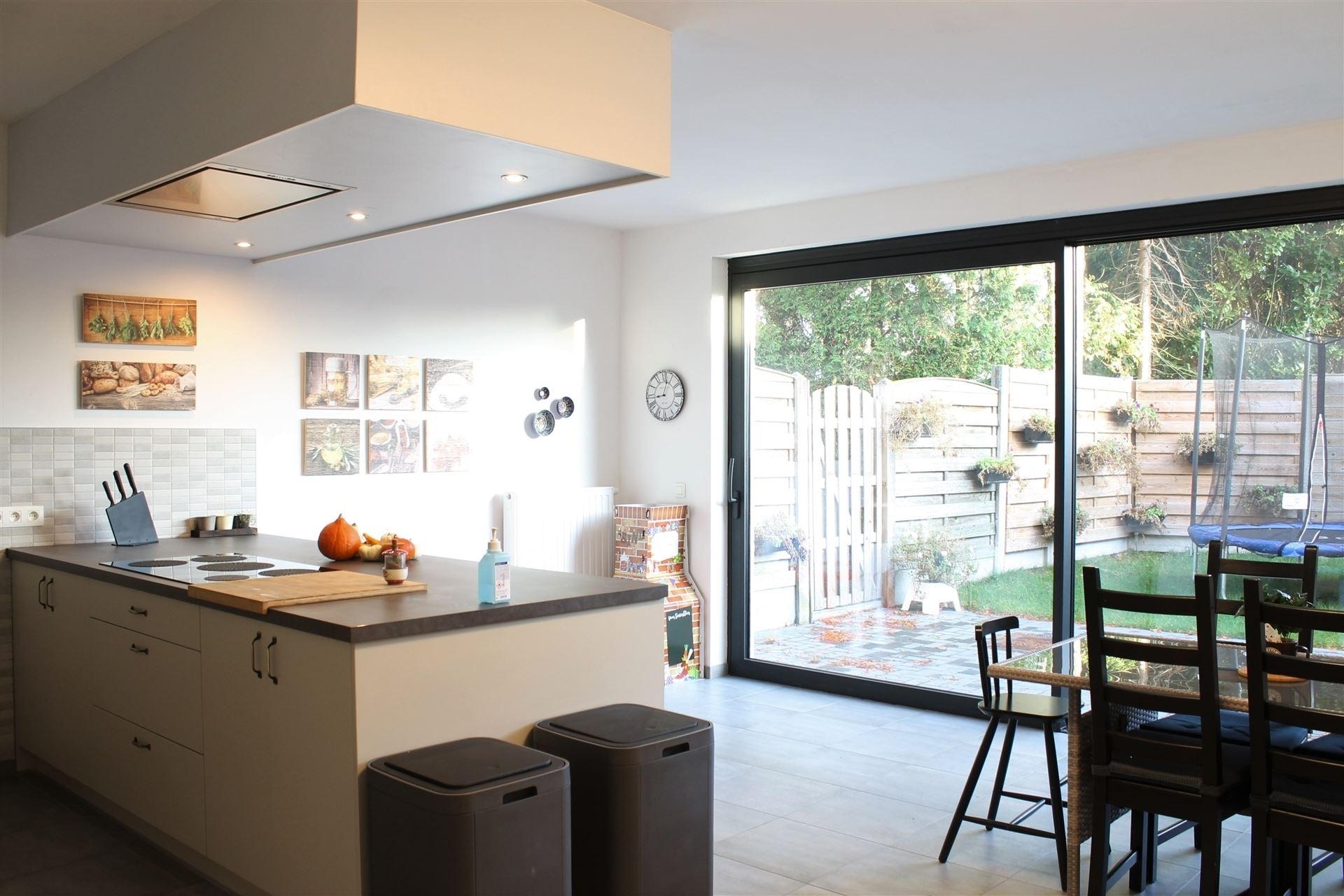 Indeling: inkomhal met afzonderlijk toilet, inpandige garage (18m²) met aansluiting wasmachine. Mooie, lichte leefkeuken met grote raampartijen welke uitgeven op de achterliggende tuin. De keuken is voorzien van een kookeiland met kookplaat en dampkap, oven, magnetron, koelkast en spoelbak.