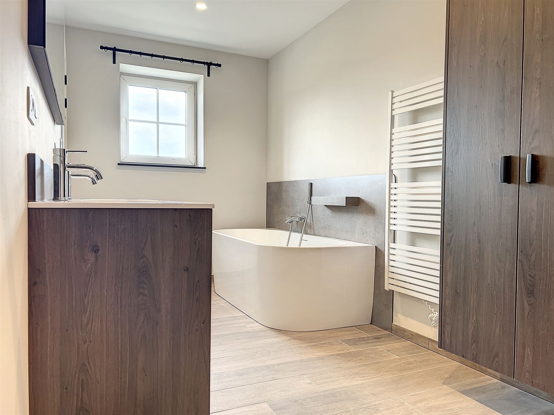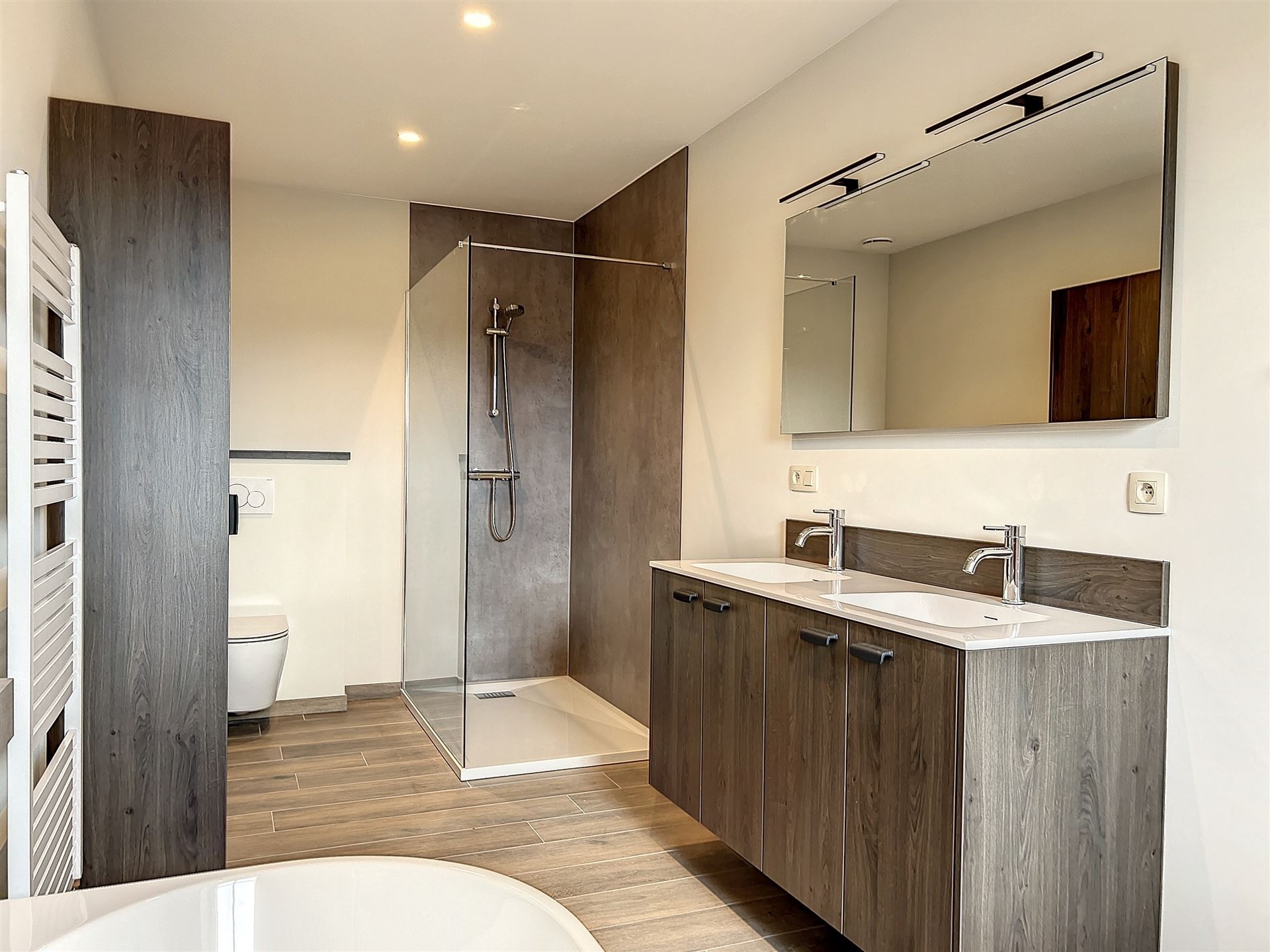 Eerste verdieping: nachthal. Drie slaapkamers van respectievelijk 17m², 18m² en 13m², waarvan de kleinste slaapkamer inbouwkasten heeft. Mooie badkamer met inloopdouche, ligbad, toilet en dubbel lavabomeubel.