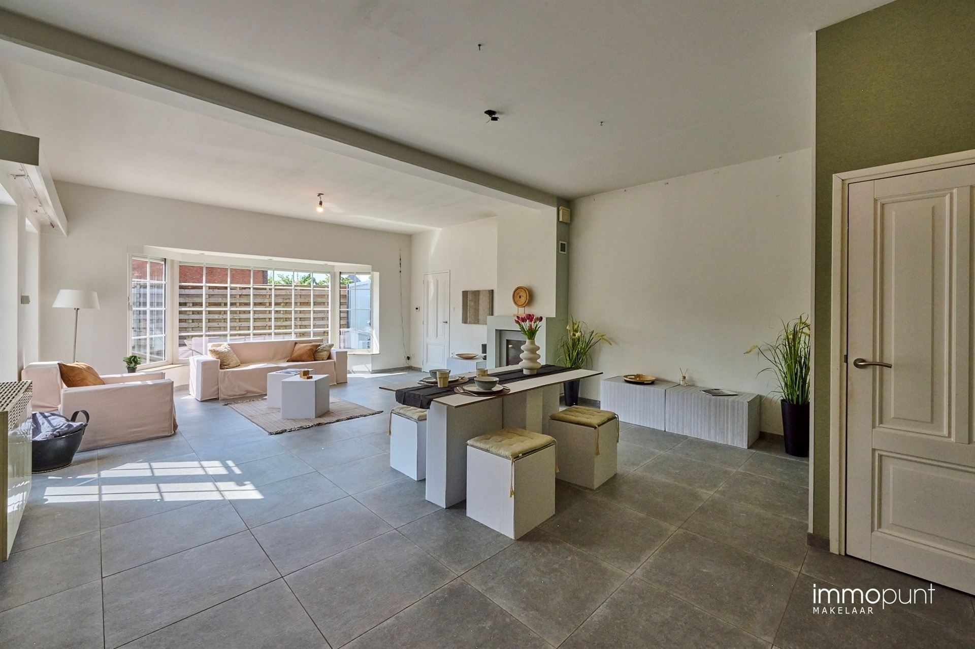 Ruime, open leefruimte met een gezellige gashaard. De leefruimte geniet van veel natuurlijk licht dankzij de erker en dubbele terrasdeuren die uitgeven op de stadstuin.