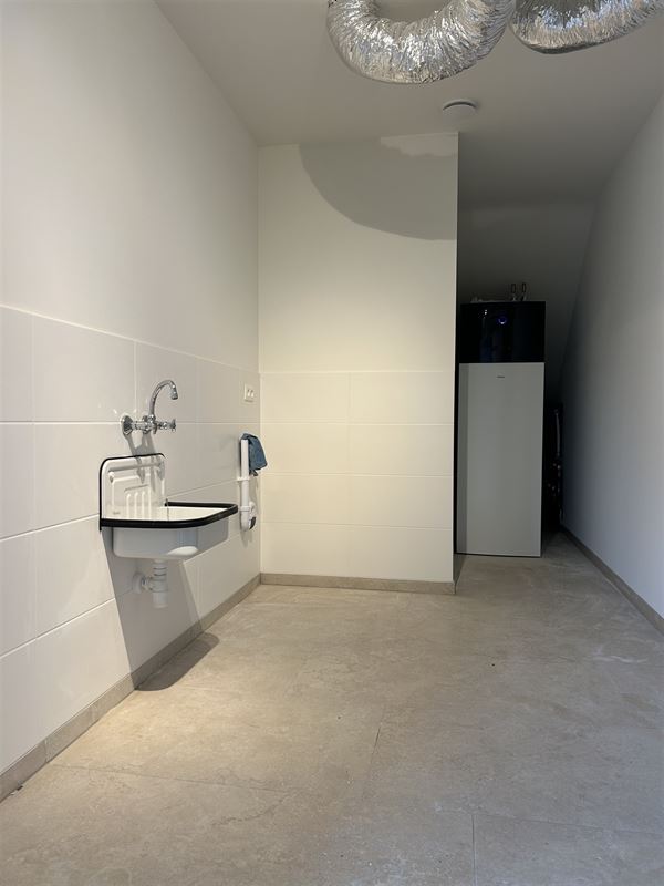 Indeling: inkomhal met afzonderlijk toilet, grote slaapkamer (13m²), kleine slaapkamer (6,5m²), volledig betegelde badkamer met inloopdouche, lavabomeubel en kolomkast. Achterinkoim. Ruime en lichte woonkamer. De moderne keuken is voorzien van een inductiekookplaat, dampkap, spoelbak, afwasmachine, koelkast en combi-oven. Aanpalend aan de keuken is er een grote berging met de technische voorzieningen en aansluiting wasmachine/droogkast.