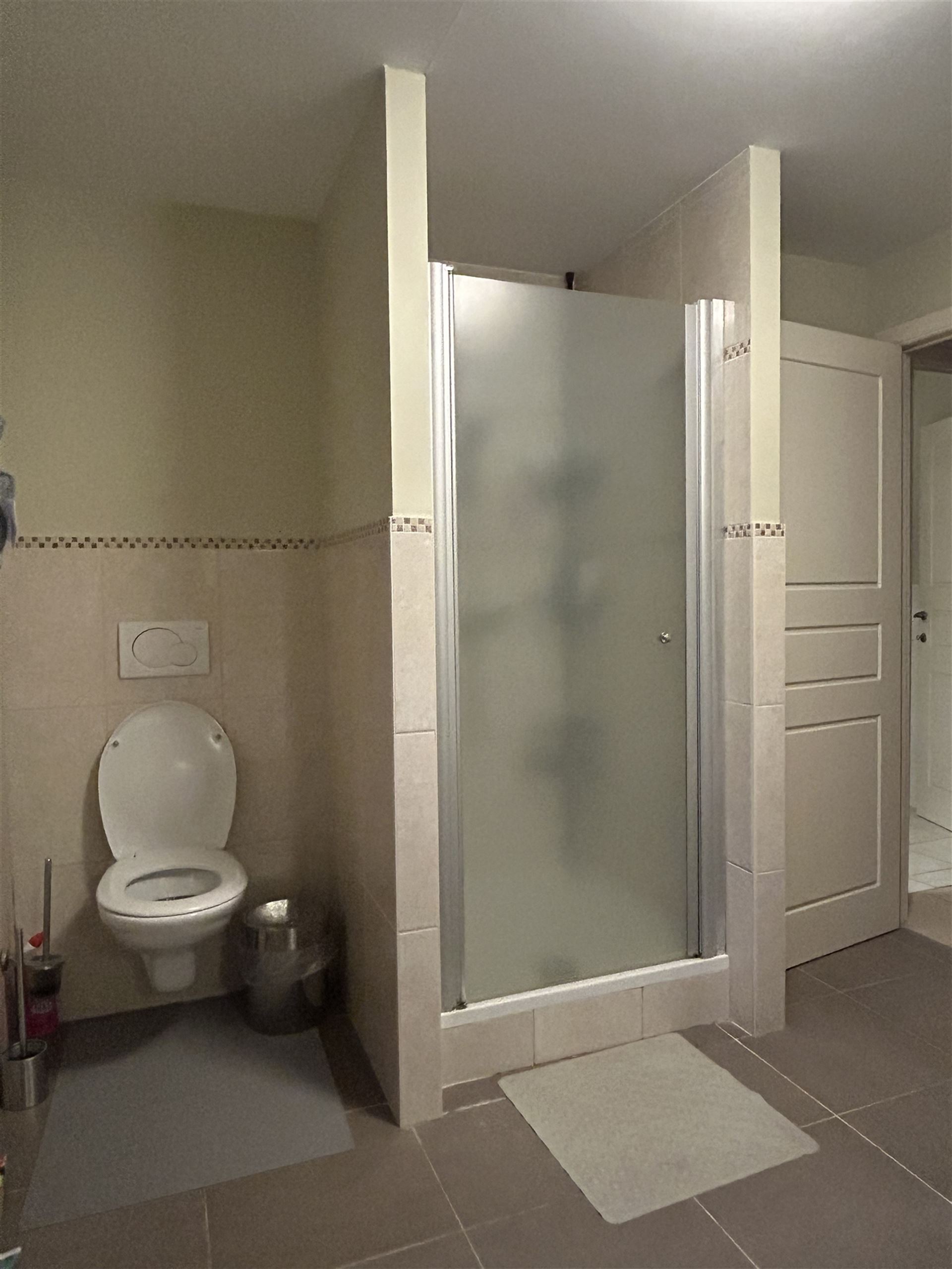 Indeling appartement: Inkomhal met vestiaire en gastentoilet, via een dubbele glazen deur komt u in de eetkamer van het appartement. Aansluitend is er een ruime keuken voorzien van keramische kookplaat, dampkap, oven, koelkast en afwasmachine. Vier trapjes hoger dan de eetkamer is er een gezellige zithoek. Op de tussenverdieping is er een mooie slaapkamer ( 18m²). Op de tweede verdieping de masterbedroom met dressing. Prachtige badkamer met groot ligbad, dubbel badkamermeubel, douche en toilet. Praktische wasplaats met uitgietbak.
