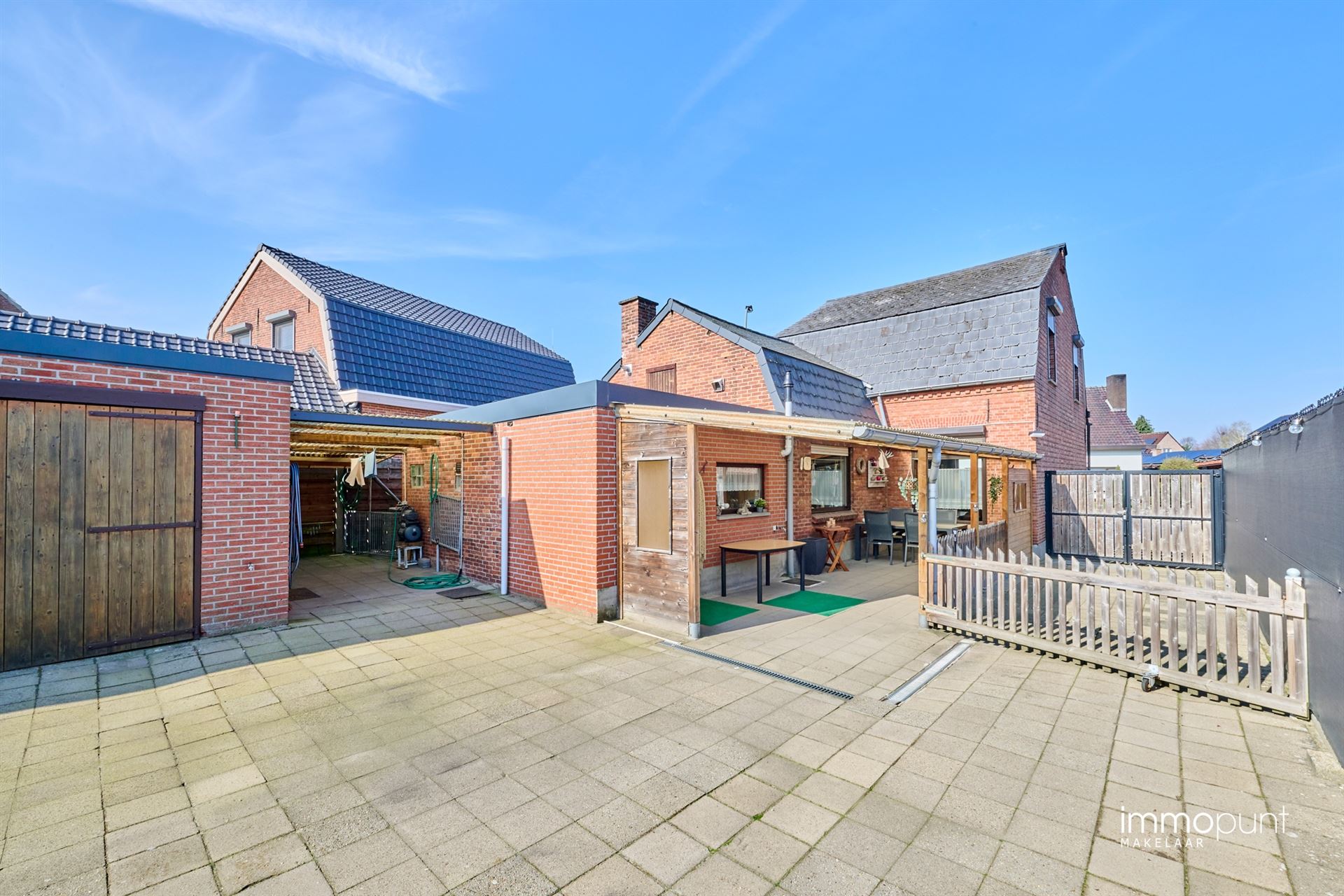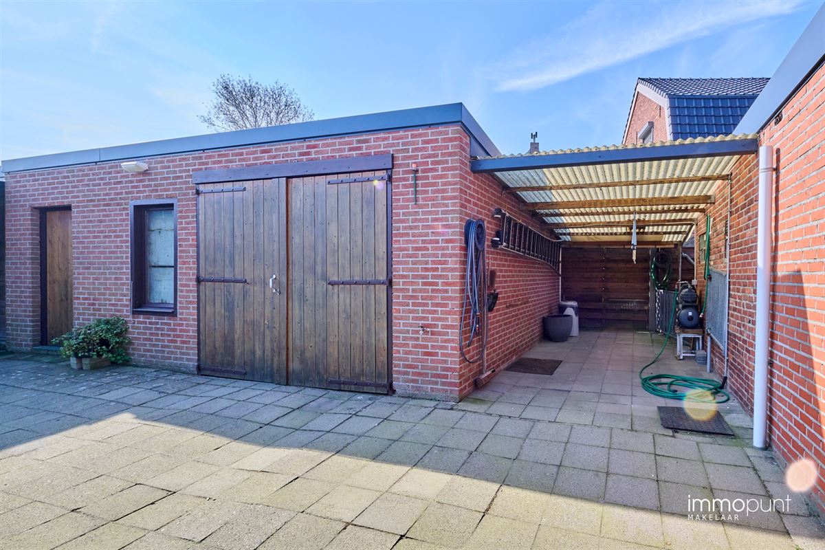 Buiten is er grenzend aan de woning een groot overdekt terras. De tuin is afgesloten met een dubbele poort en volledig omheind. Er is een grote garage, veel opbergruimte en een carport. Geniet van een diepe tuin met verzorgd gras, ideaal voor gezinnen of tuinliefhebbers.