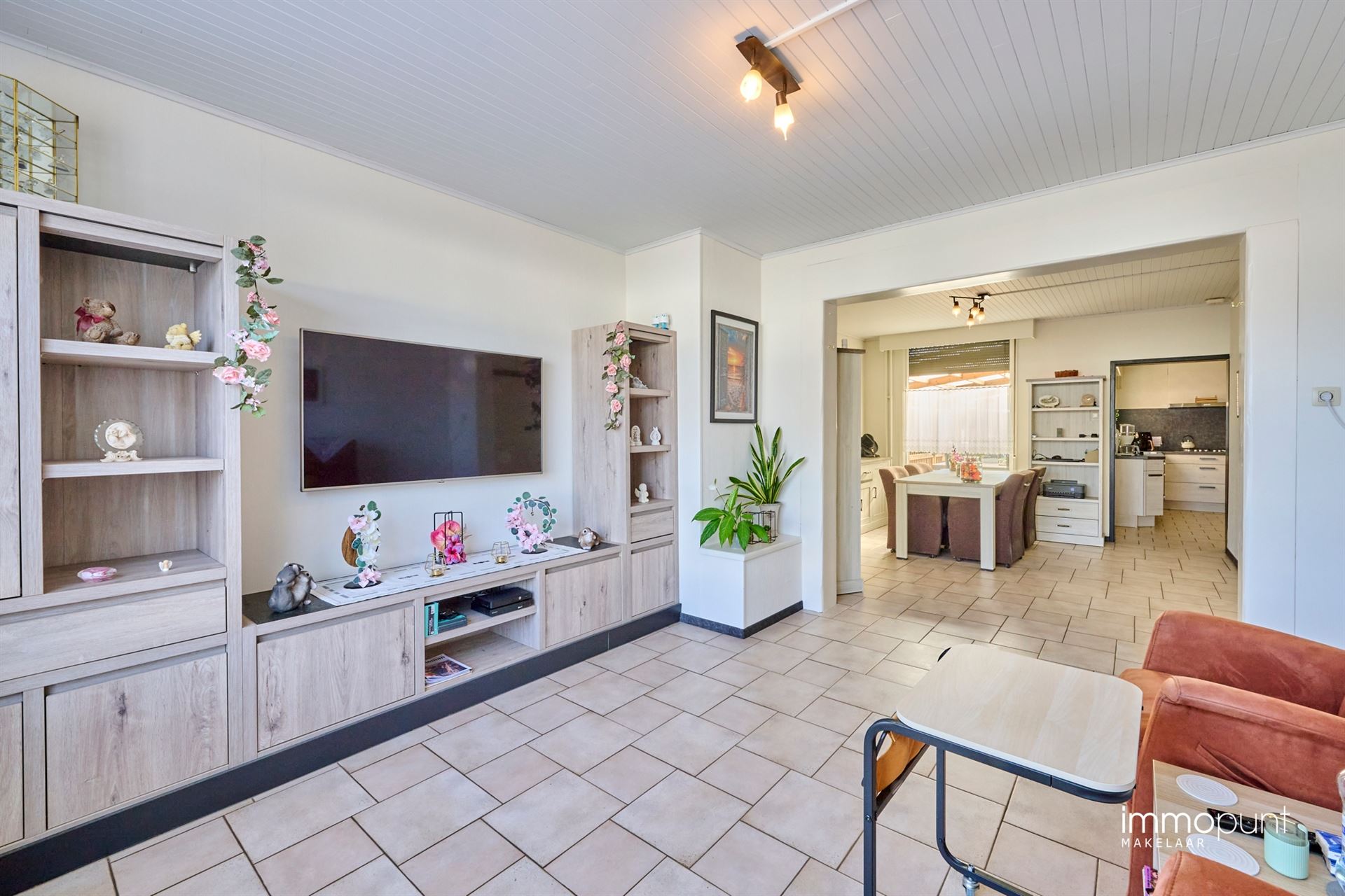 Indeling: inkomhal, grote leefruimte. Nette keuken (2016) met een groot werkblad en veel kastruimte. De keuken is voorzien van een gasfornuis, dampkap, spoelbak, afwasmachine, oven en magnetron. Aanpalend aan de keuken is er een bergruimte. Vanuit de keuken is er ook toegang tot de kelder. Grote achterinkom met veel inbouwkasten. Afzonderlijk gastentoilet. Volledig betegelde badkamer met grote inloopdouche, badkamermeubel en toilet. Verder bevindt er zich op het gelijkvloers nog een slaapkamer van 4,15m x 3,05m.